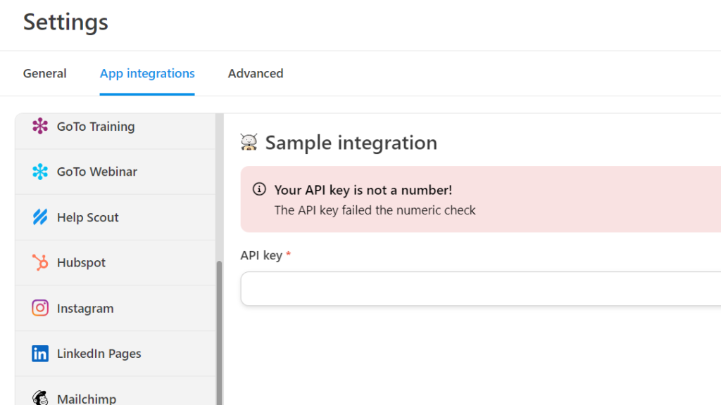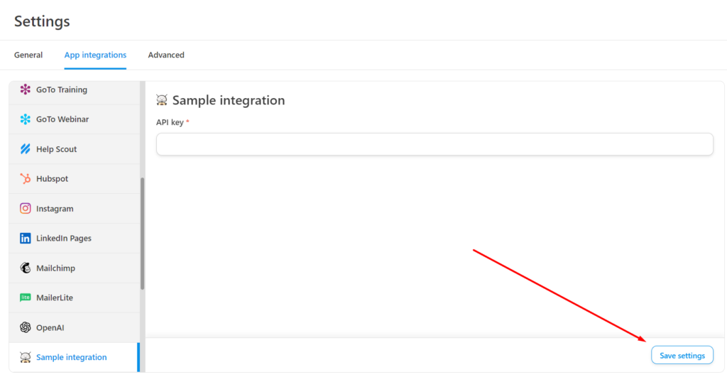 Let’s add a Settings page to our integration. This settings page will allow users to enter some value and store it, for example, an API key: