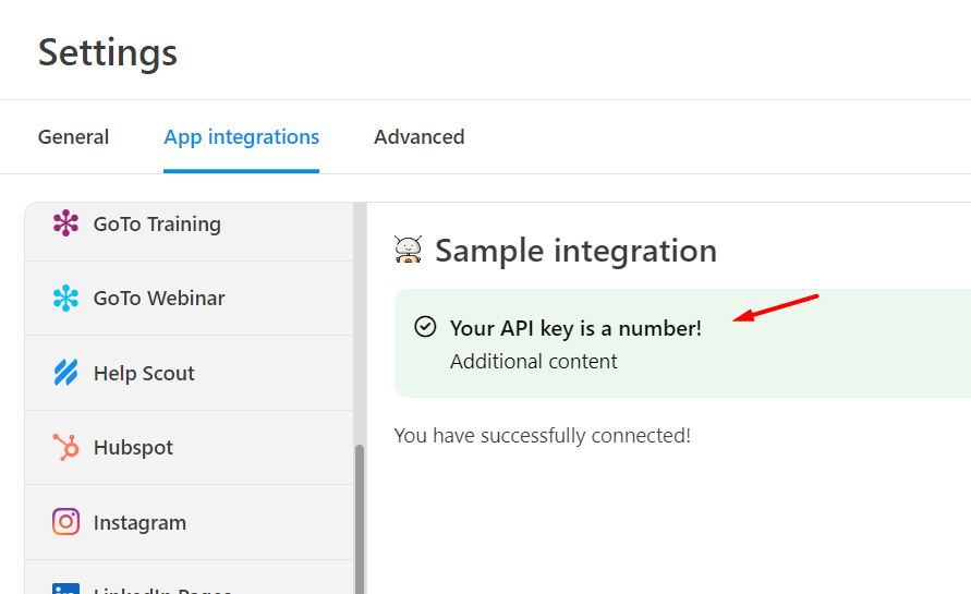 In our code example, we only check if there is an API key stored to determine if our integration is connected.